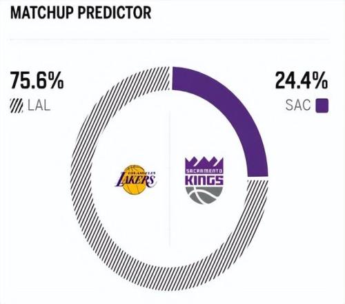 这是两队本赛季的第三次交锋,前两次对决湖人全胜。赛前,美媒ESPN对本场比赛进行了胜率预测,湖人胜率为75.6% ,占据绝对优势,国王队胜率则仅有24.4% 。